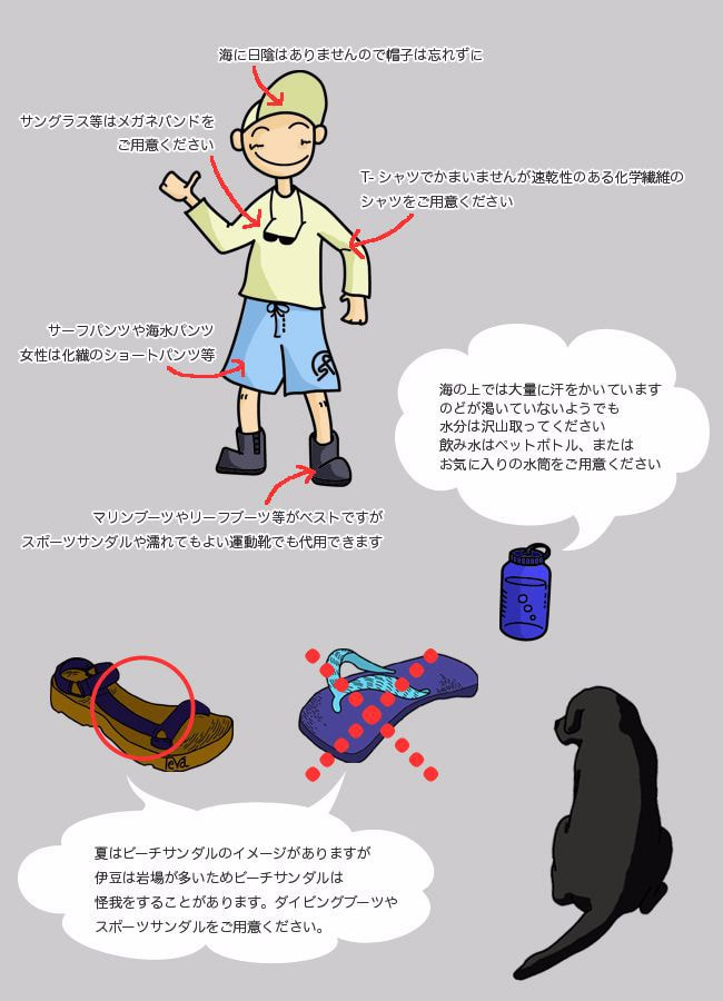 ☆ 季節によって若干異なりますが、以下の服装は5月から10月ごろまで対応できます。曇り空や雨が心配の時はウィンドブレーカーをご用意ください。防寒用としても使用できます。