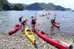 のんびりカヤックを漕ぎながらスタートした浜へ戻ります。最後に皆で写真を撮って名残惜しくもツアーは終了。みんなで後片付けをして解散です。終了後には近くの温泉や食事処など紹介いたしますので皆様のご都合と合わせてガイドにお聞き下さい。また当日ガイドが撮影した写真はWebアルバムにて無料ダウンロードできます。伊豆の思い出を忘れないでください。