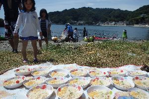 しっかり遊んで浜に上陸したらお昼ご飯を食べましょう!お昼ご飯はお子様でも食べやすいどんぶりのお弁当を用意しております!流木のベンチに座ったらちょっとしょっぱいお昼ご飯を食べましょう。午後もめいいっぱい遊ぶためにたくさんご飯を食べてください!